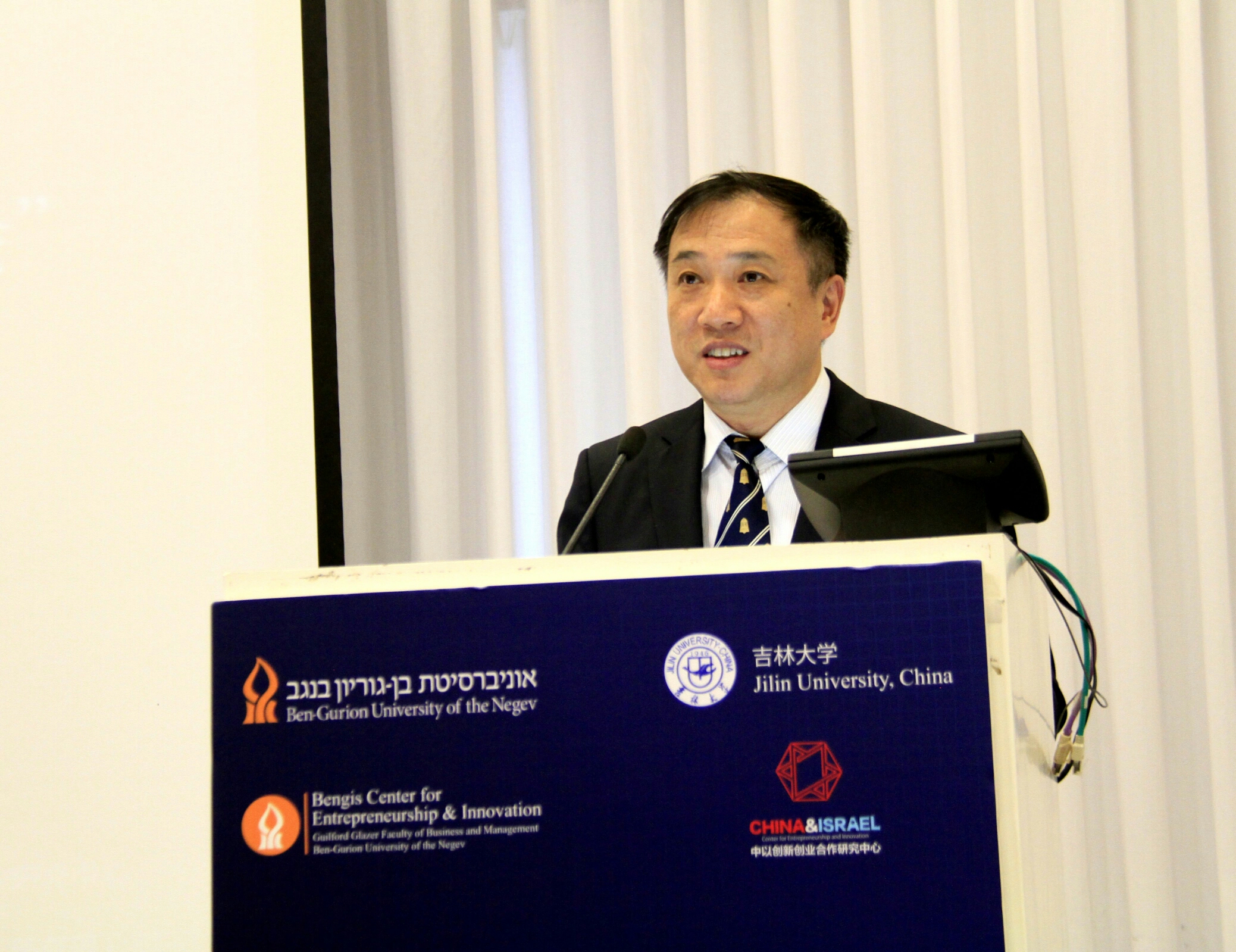 在会议联合主席、Bengis创新创业中心主任代芙娜教授主持下,9499www威尼斯校党委书记杨振斌教授、以色列本·古里安大学校长丽芙卡·卡米尔教授、共青团吉林省委书记程龙博士、中国驻以色列大使馆教育处姜延东一秘、以色列外交部代表潘立文等分别在开幕式上致辞。